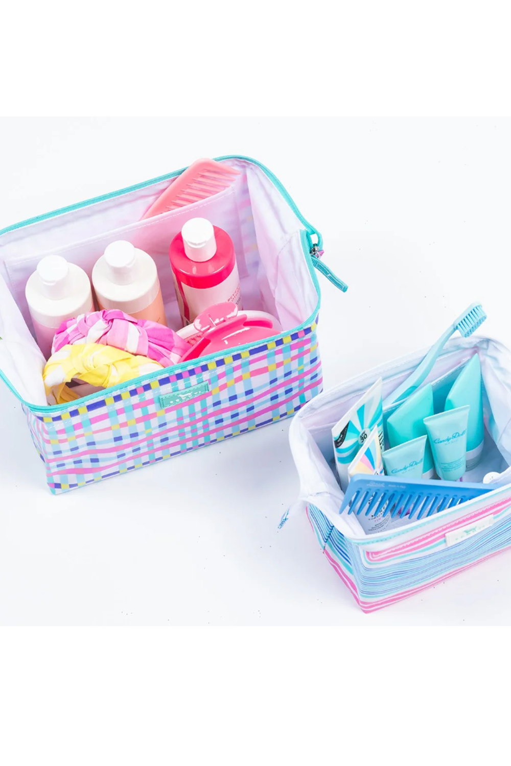 Open… WIDE! Designed for maximum access, this easy-clean bag not only opens up wide but it stays open thanks to a built-in wire frame. Ideal for travel (three-ounce bottles fit upright) or at-home countertop use. Smaller version also available.