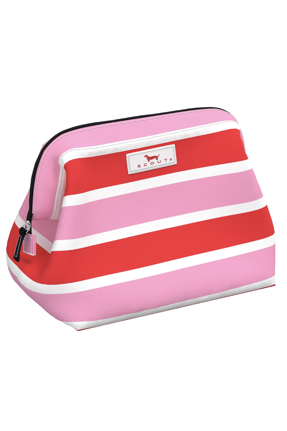 Open… WIDE! Designed for maximum access, this easy-clean bag not only opens up wide but it stays open thanks to a built-in wire frame. Ideal for travel (three-ounce bottles fit upright) or at-home countertop use. Smaller version also available.
