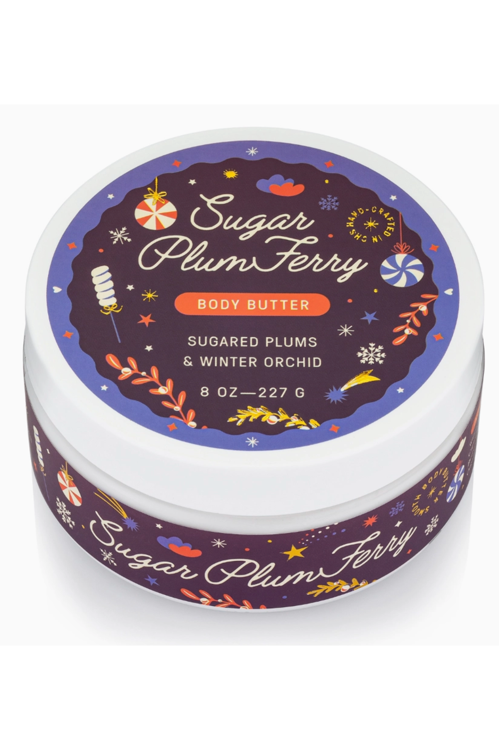 Set sail into a world of holiday magic with Sugar Plum Ferry™, a whimsical fragrance that blends sweet, fruity warmth with a coastal breeze of enchantment. Juicy plum and a splash of citrus sparkle like sugar crystals, with soft sandalwood and winter orchid. Inspired by a charming ferry boat drifting through a sea of snowflakes and candy-colored dreams. Top Notes: Plum, Mandarin, Violet Base Notes: Sandalwood, Winter Orchid Our body butter is lightweight and soaks in quickly. Our blend of shea butter, sunflower oil and aloe vera is nourishing and great for all types of skin. Our body butter is thicker than traditional lotion and extra moisturizing. Say hello to healthy, smooth skin! This 8oz body butter jar is perfect for bathrooms & bedside tables! Also available in an 2oz travel size. NO: mineral oil, parabens, sulfates, phthalates or color. Features gold foil accents, embossed elements, and original artwork by Lulu Dubreuil for a festive Christmas or holiday gift!