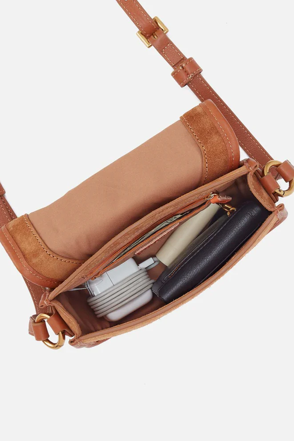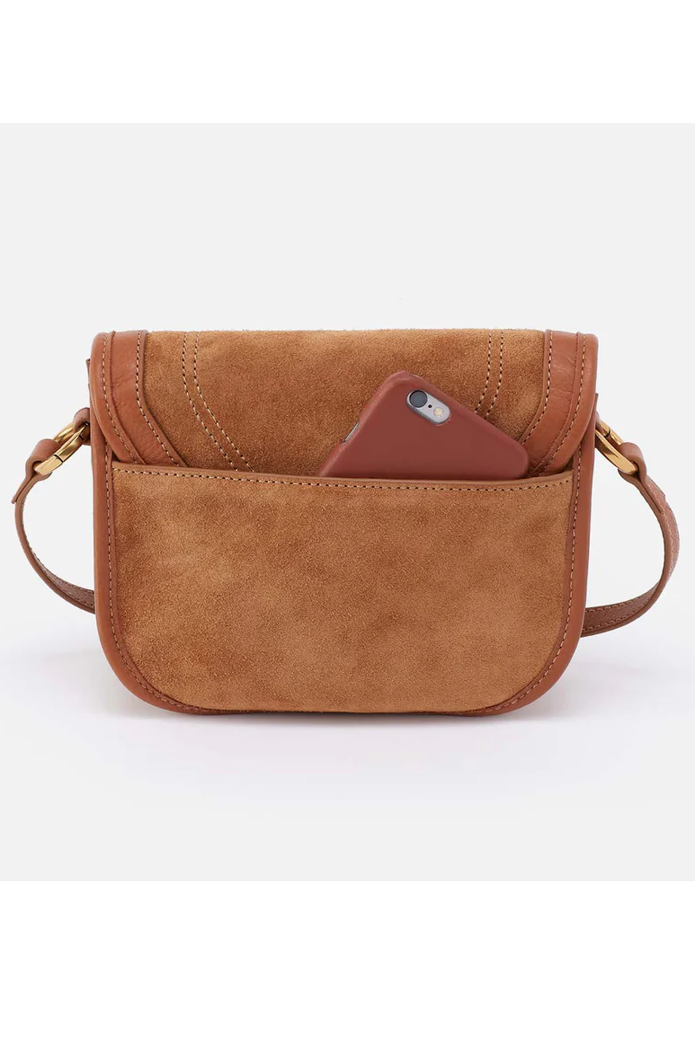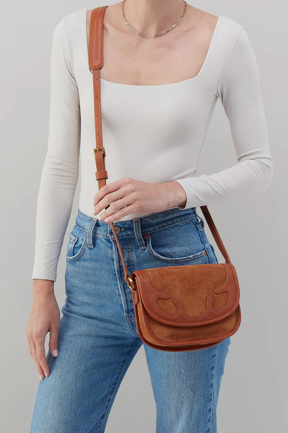 This saddlebag crossbody channels our heritage spirit in richly textured suede, finished with handcrafted details. An everyday shape with a free-spirited feel, and a strap you can adjust—or remove entirely—to fit your journey.