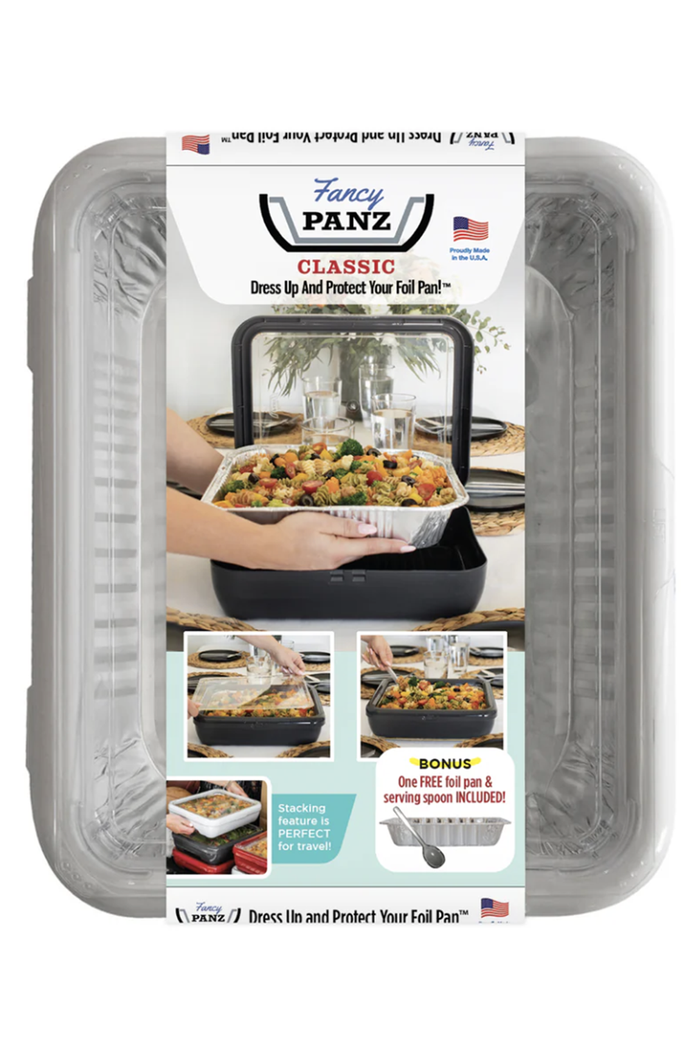 Fancy Panz Classic is the stylish solution to those flimsy, unattractive foil pans. It offers the perfect blend of convenience and presentation, making it ideal for potlucks, parties, tailgates, BBQs, picnics, or as a thoughtful hostess gift. With Fancy Panz Classic, there’s no need to worry about scrubbing grimy pans or lugging home dirty serving dishes. Simply lift out the disposable foil pan, give your Fancy Panz a quick wipe, and you're done.