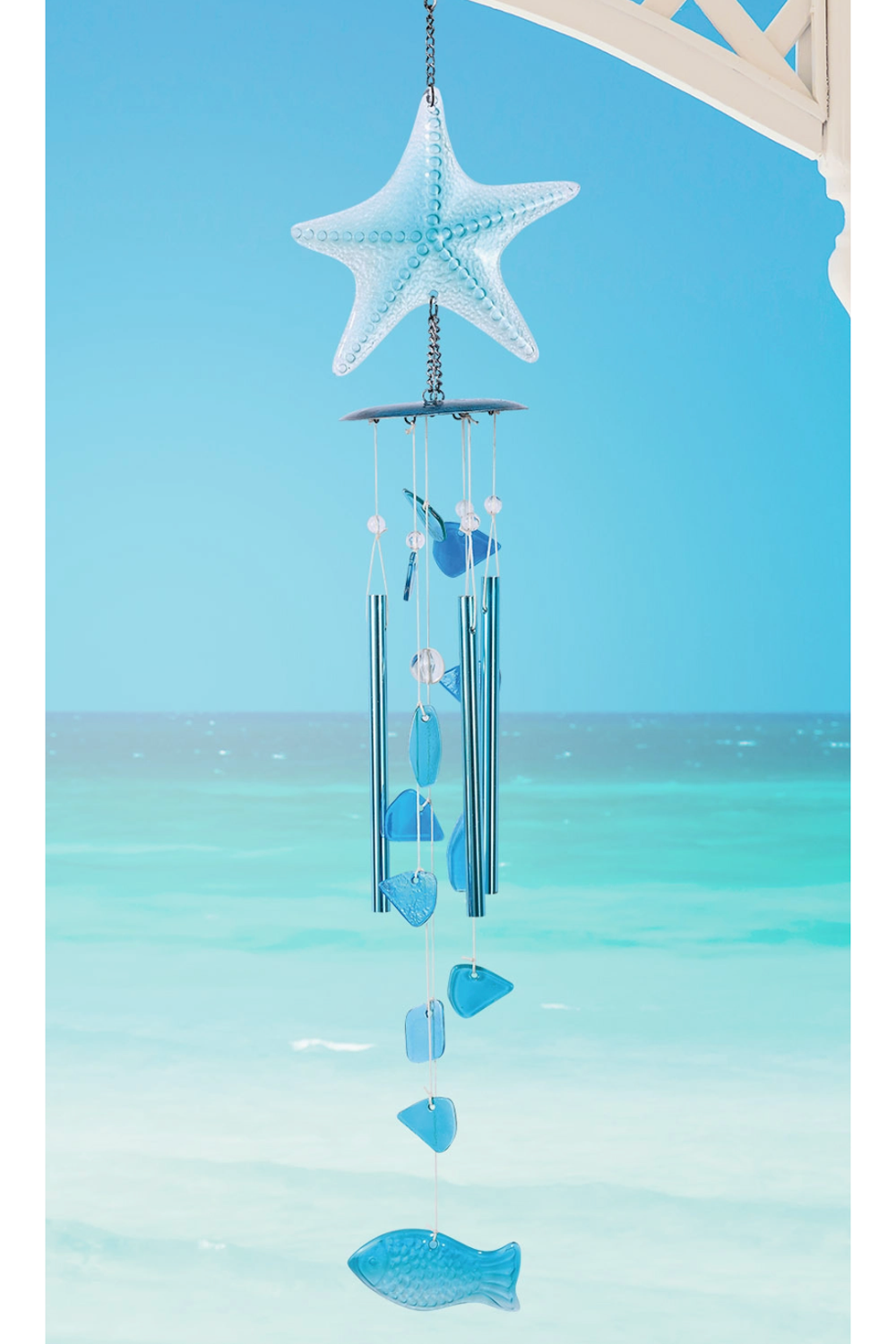 If you are familiar with the starfish story, this chime will heighten your smile. This artisan hand-crafted Starfish Glass Wind Chime is a good reminder to us all that yes, even the smallest thing can make a difference. The blue starfish sits atop multicolored glass coastal icons entwined with chunks of emulated, natural worn sea glass worn sea glass with three metal tubes to create that coastal twinkle sound. The tropical blue fish adds balance and motion as a wind catcher. Artisan hand-crafted - colored recycled glass, nylon & metal. Replicated, colored worn sea glass. Easy hang decorative metal hook included. Displays beautiful hues of blues & turquoise. Adds a great splash of color for your beachside paradise. Measures approximately: 7" x 4.5" x 32"