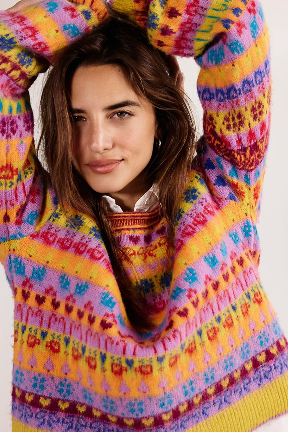 Lines of sweet motifs give this wool-blend sweater the perfect charming look.