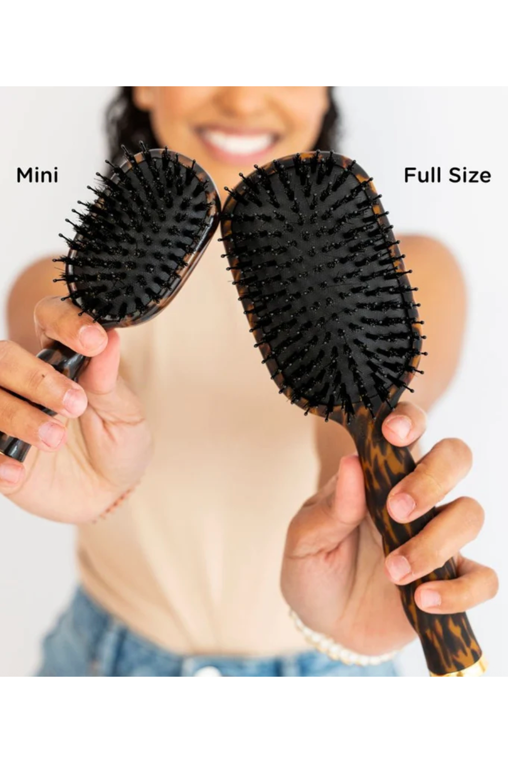 The Mini Boar Bristle Hair Brush in Tan is your go-to for smooth, polished touch-ups on-the-go. Natural bristles help reduce frizz and boost shine by distributing oils from root to tip, making it a perfect mini hair brush for travel and everyday styling.