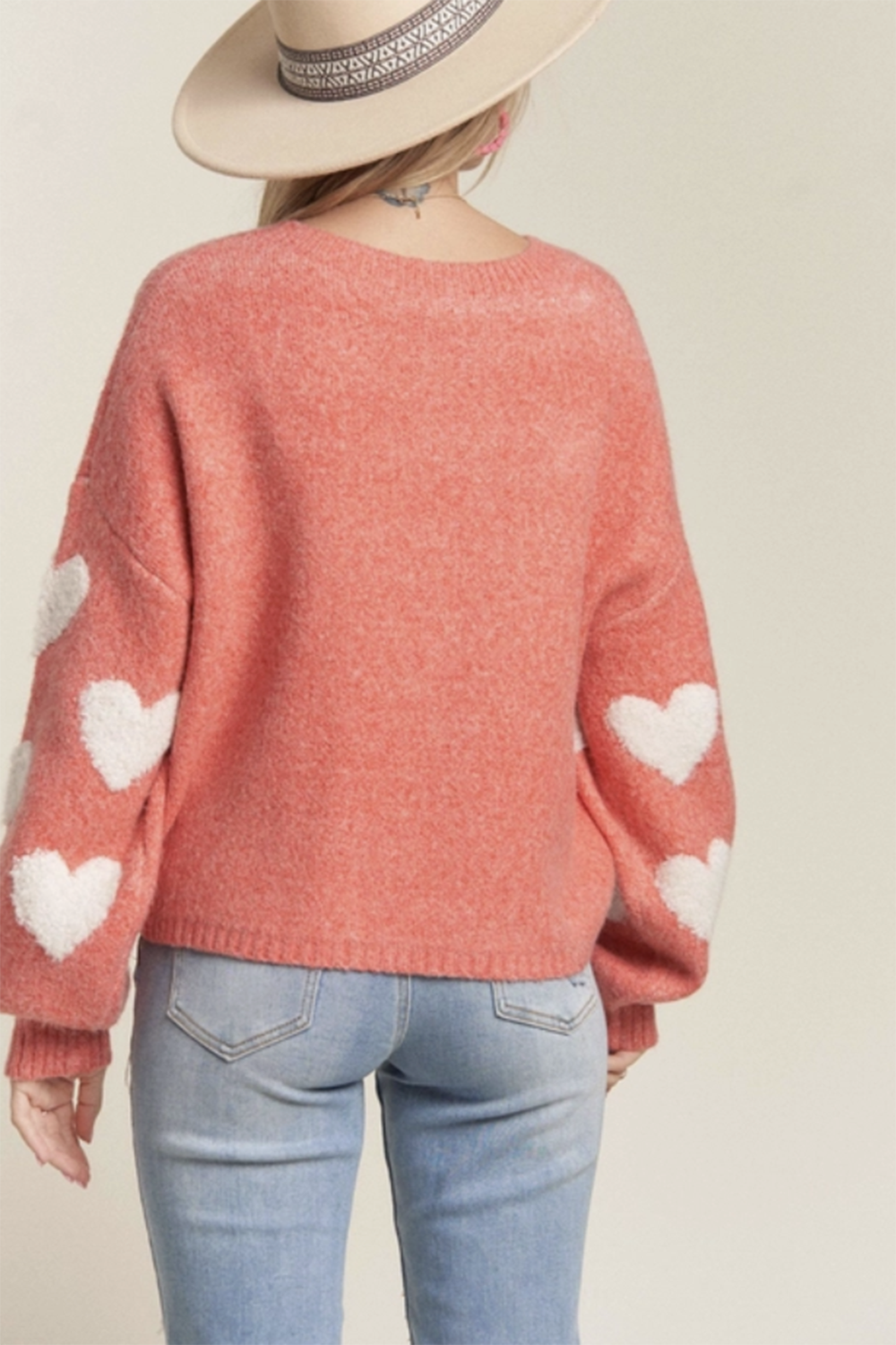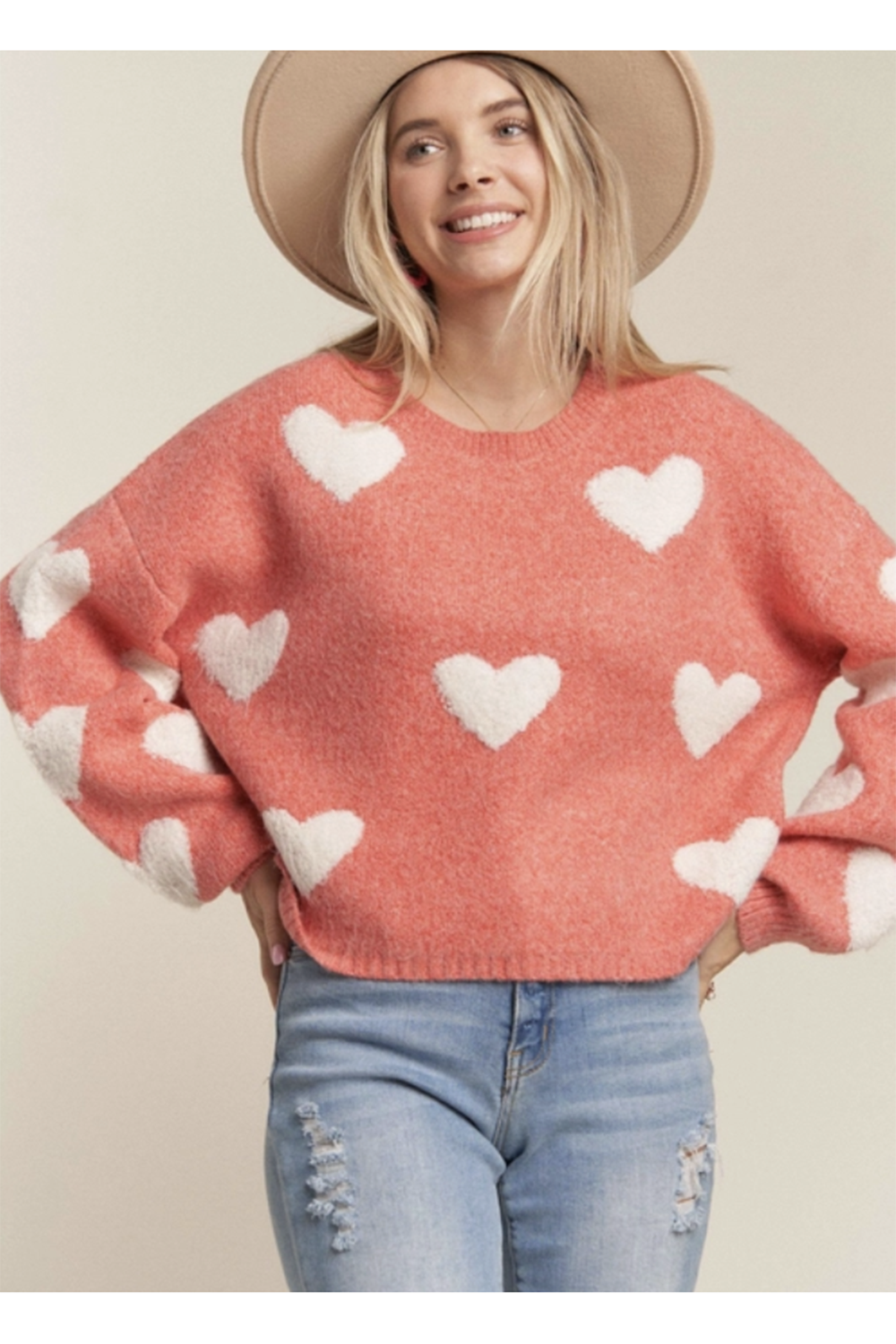 HEART PRINTED CREW NECK LONG SLEEVE SWEATER TOP 47% POLYESTER 35% ACRYLIC 15% NYLON 3% SPANDEX *Crew neck *Heart patterned sweater *Lovely, Cozy, Comfy wear Actual product color may vary from the images shown. Every monitor or mobile display has a different capability to display colors, and every individual may see these colors differently.