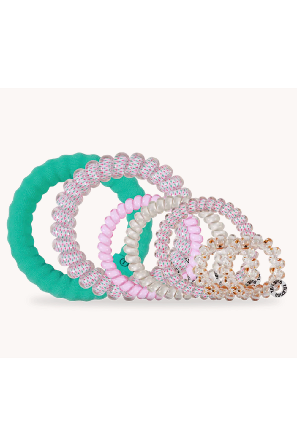 The TELETIES Christmas Tree Ornament includes 2 Tiny Hair Ties, 3 Small Hair Ties, 1 Large Hair Tie and 1 Large Nylon Hair Tie.
