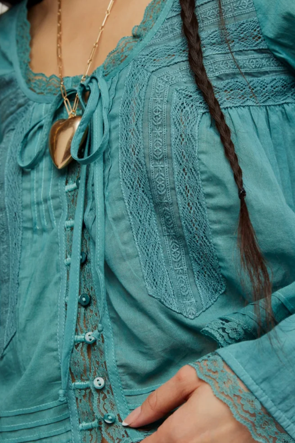 Features: Soft cotton fabrication, square-neckline with tie detail, button closures, long-sleeves with cuffs, sheer lace trim
