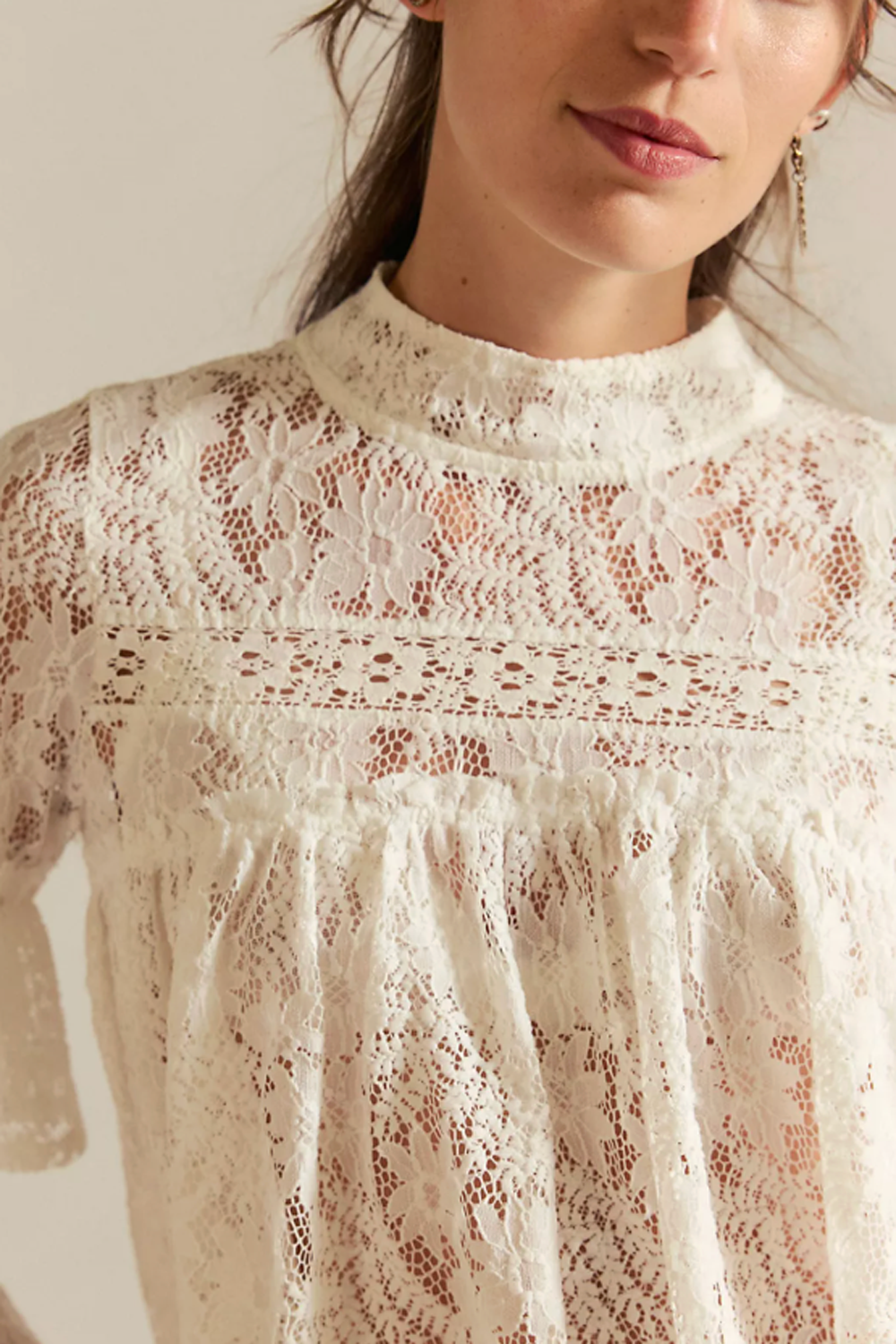 So delicate with lace all over, this stunning blouse is featured in a mock-neck style with ruffled accents and a billowy bodice.