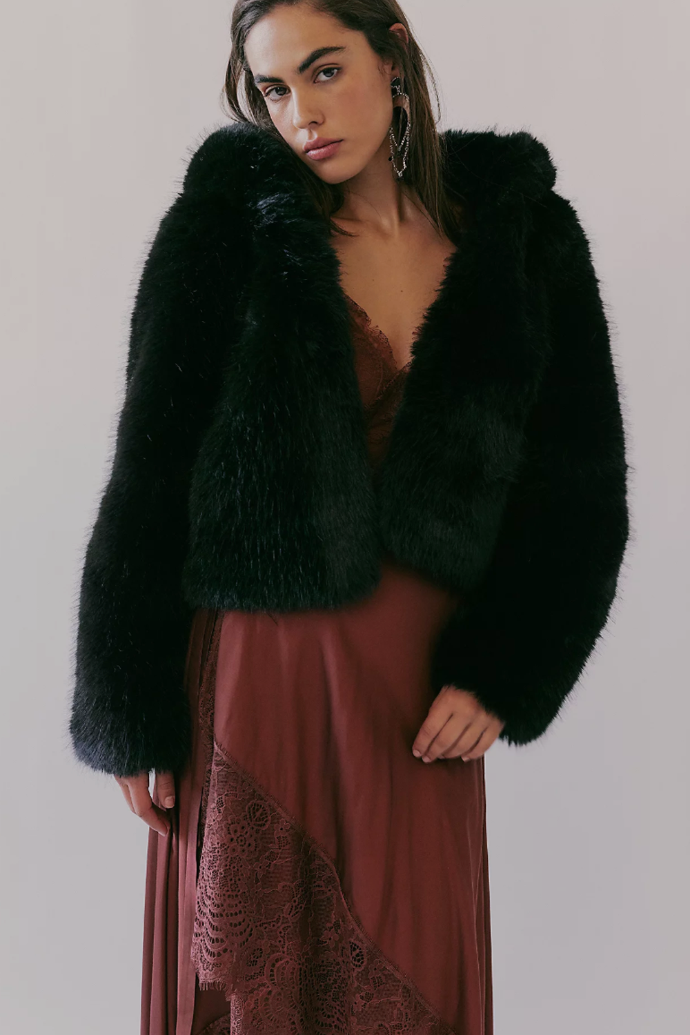 The lush life is all yours in this luxe fur jacket, featured in a faux style with an attached hood for extra cozy moments.