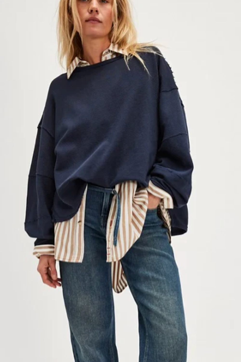 An elevated take on the classic tee, this long-sleeve features a ribbed fabrication and slouchy silhouette with defined seams and a scoop-neckline.