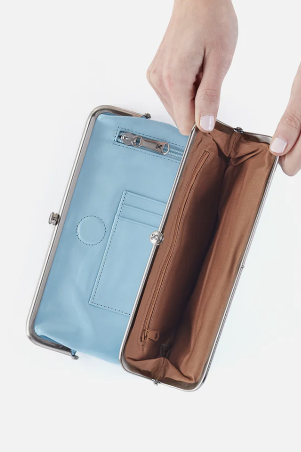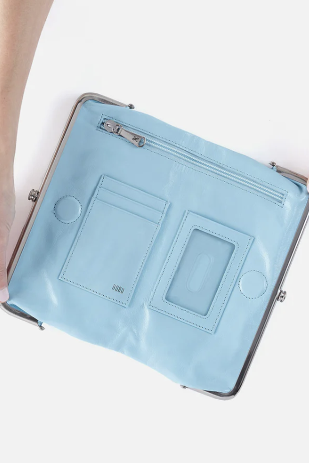 - Front Frame Compartment: Zip pocket; Back Frame Compartment: Bill slot, slip pocket & 6 credit card slots