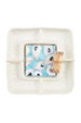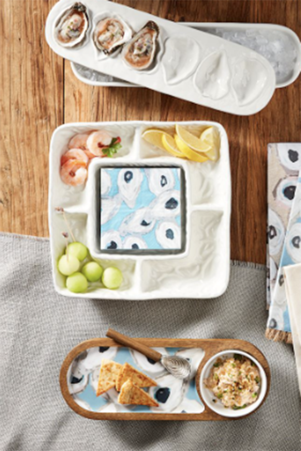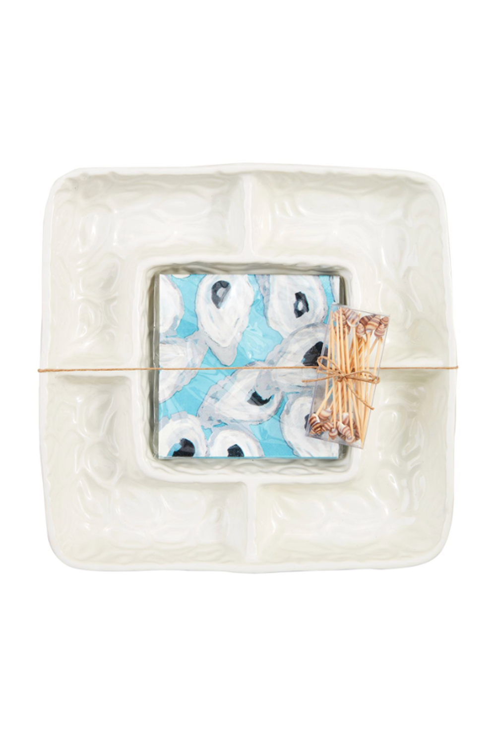 3-piece set. Textured stoneware sectioned server with center well to hold pack of 12 paper napkins. Comes with pack of shell topped toothpicks.
